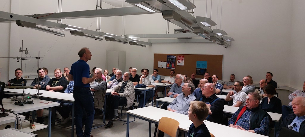 Der Gang durch die Schule ließ die Ex-Abiturientinnen und -Abiturienten in Erinnerungen schwelgen, die bis zu fünfzig Jahre zurücklagen. Dabei wurde auch die ein oder andere Anekdote aus der vergangenen Schulzeit erzählt. Für viele hat sich natürlich Einiges im MPG verändert, wie z.B. das Mobiliar und die digitale Ausstattung. Aber in der Aula, in der Turnhalle und im Skikeller war man sich einig, dass es sich hier um absolute Originale handle. Natürlich konnten die Ex-MPGler.innen, die teilweise eine Anreise von mehr als 1000 Kilometern auf sich nahmen, am Samstagnachmittag auch noch Unterricht im Fach Physik genießen.