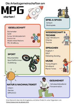 Auch in diesem Schuljahr werden am MPG wieder viele verschiedene AGs angeboten, die über den „normalen“ Unterricht hinausgehen. Die Arbeitsgemeinschaften sind schon lange ein fest etablierter Bestandteil des Schullebens. Das breite Spektrum an AGs berücksichtigt viele verschiedene Bereiche, um den unterschiedlichen individuellen Neigungen, Begabungen und Talenten unserer Schülerinnen und Schüler sowie deren Bedürfnissen gerecht zu werden.