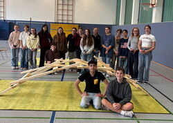 Aus Holzbohlen eine stabile Brücke bauen, obwohl weder Schrauben noch Nägel oder anderes Werkzeug zur Verfügung stehen? Am 18.09.25 bauten die Schülerinnen und Schüler des 8. Jahrgangs im Rahmen eines Wettbewerbs eine "Leonardo-Brücke". Der Wettbewerb wurde ausgerichtet von der Ingenieurkammer-Bau NRW und soll Interesse wecken an MINT, insbesondere an Ingenieurberufen und Technik.