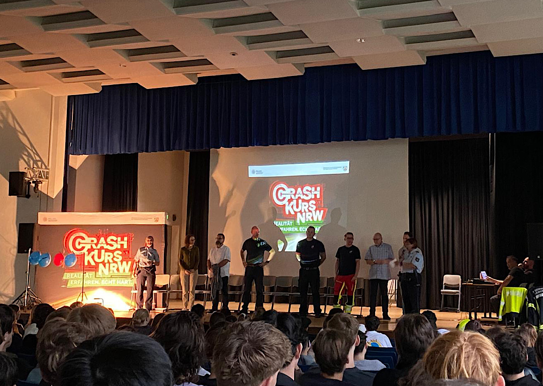 Am 09.09.2025 erlebten die Schülerinnen und Schüler der Jahrgangsstufe 10 in der Aula des MPG den „Crash-Kurs NRW“, ein von der Polizei durchgeführtes Präventionsprojekt. Es soll dazu beitragen, schwere Verkehrsunfälle, bei denen junge Menschen verletzt werden oder zu Tode kommen, zu verhindern. Mitarbeiterinnen und Mitarbeiter von Polizei, Feuerwehr, Rettungsdienst und Notfallseelsorge berichteten über ihre Einsätze und zeigten Fotos und nachgestellte Videos von Unfällen, die durchjunge Erwachsene verursacht wurden, z.B. aufgrund von überhöhter Geschwindigkeit oder Alkoholkonsum. Die Schülerinnen und Schüler reagierten zum Teil nachdenklich, betroffen und schockiert. Neben dem MPG nahmen auch die zehnten Klassen des AvD und der Gesamtschule Buer-Mitte an der Veranstaltung teil. Die allgemeine Meinung am Ende war: Dieses Projekt wirkt nachhaltig und kann Leben retten.