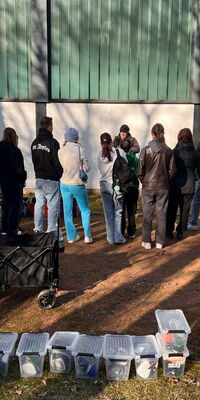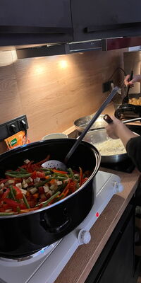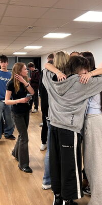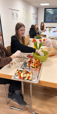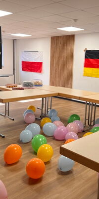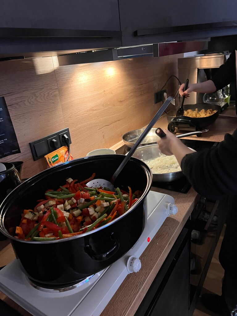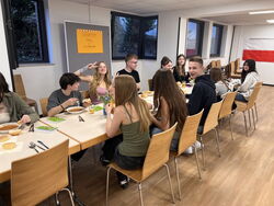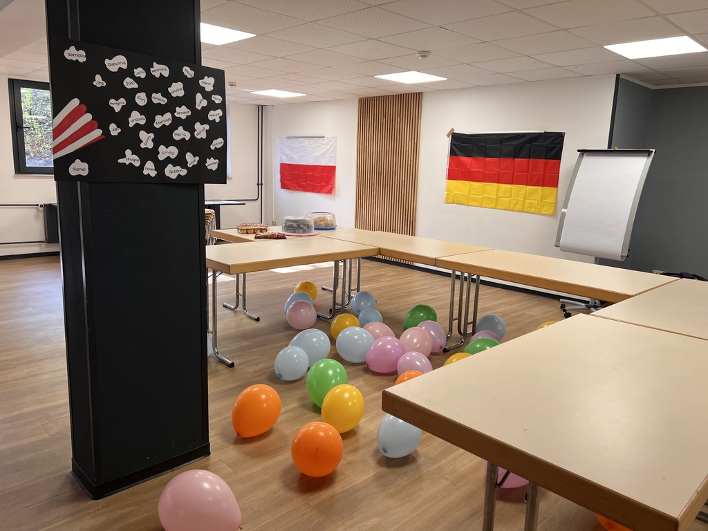 Unsere Gäste aus Olsztyn – ebenfalls 15 Schüler:innen und Schüler des V LO sowie begleitende Lehrkräfte – wurden am 04.04.25 im Gästehaus Heege herzlich empfangen, wo uns von morgens bis abends Räumlichkeiten zur gemeinsamen Nutzung zur Verfügung standen. Nachdem der Gruppenraum durch unsere Schüler:innen liebevoll dekoriert und in der Küche ein schmackhaftes Essen für alle zubereitet worden war, lernte die Gruppe sich nach einem gemeinsamen Abendessen im Rahmen von lebhaften Spielen kennen. Am nächsten Morgen wurde zunächst ausgiebig gemeinsam gefrühstückt. Ein Dank gilt an dieser Stelle der Stadtbäckerei Gatenbröcker, die uns täglich mit einer großzügigen Spende an frischen Backwaren versorgte!