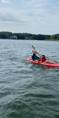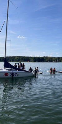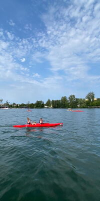 Dort ging es zunächst im Kajak oder Tretboot hinaus auf das Wasser – ein besonderes Highlight, auf das sich alle schon lange gefreut hatten! Im Anschluss gab es noch Zeit für Beachvolleyball, Badminton oder ein entspanntes Sonnenbad. Abgerundet wurde der Tag durch ein gemeinsames Pizzaessen am See, das dank der wunderschönen Aussicht auf das Wasser lange in Erinnerung bleiben wird.