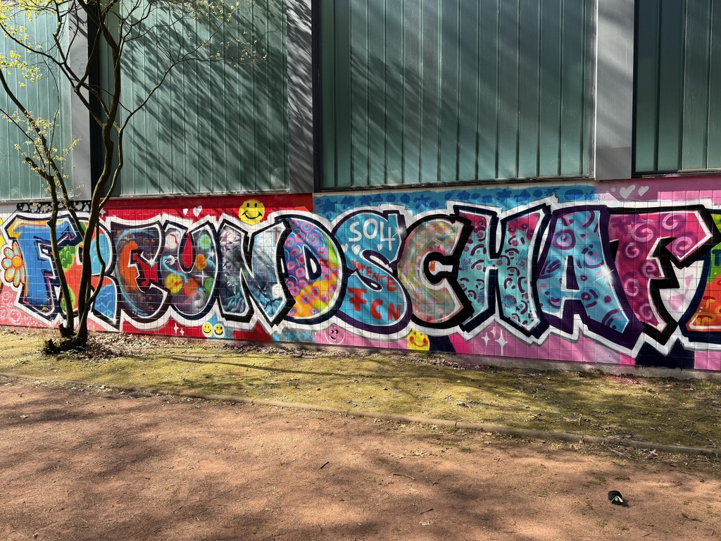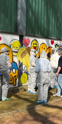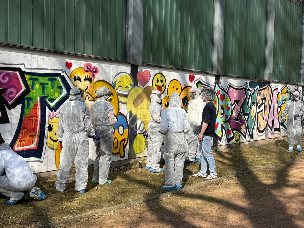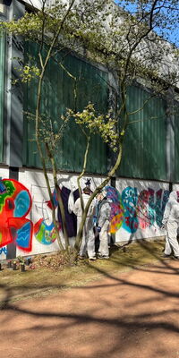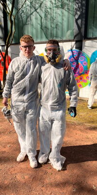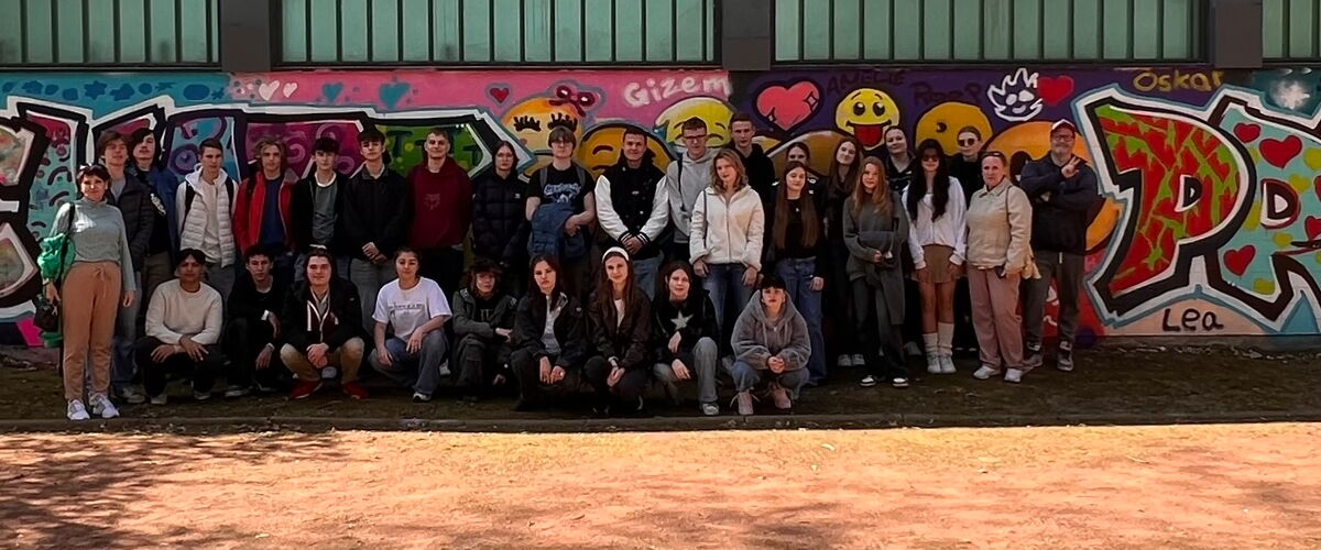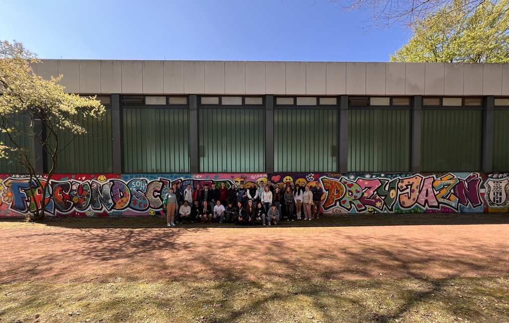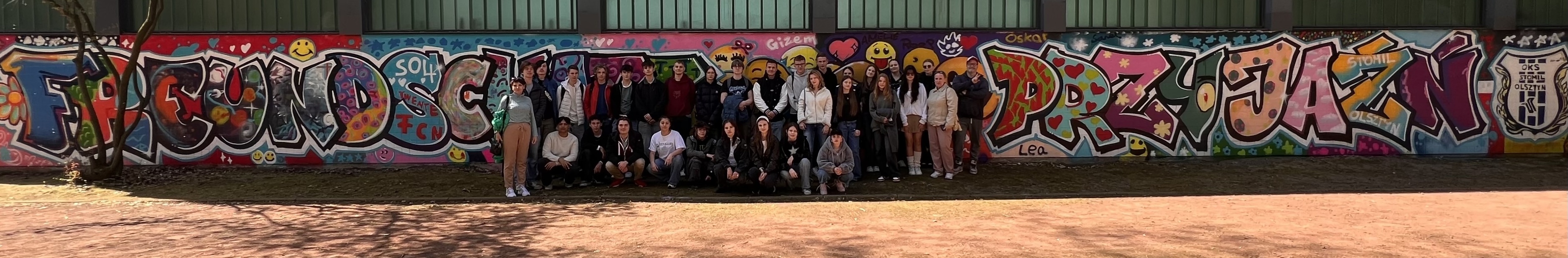 In den beiden darauffolgenden Tagen (08.04.-09.04.25) stand das gemeinsame Graffiti-Projekt unter professioneller Leitung des Street-Art Künstlers Daniel Dinsing im Vordergrund. Nachdem die Gruppe morgens in der Schule eingetroffen war, ging es für einen Teil der Jugendlichen direkt an die Sprühdosen, während die übrigen Schüler:innen den Vormittag mit Unterrichtshospitationen sowie gemeinsamer Workshoparbeit verbrachten. Am nächsten Tag wechselten die Gruppen ihr Programm, sodass alle Teilnehmenden sowohl aktiv am Kunstwerk mitwirken als auch den Schulalltag am MPG erleben konnten, was insbesondere für unsere polnischen Gäste eine interessante Erfahrung war. Bei der künstlerischen Ausgestaltung der Schriftzüge „Freundschaft“ und „Przyjaźń“ durften die Jugendlichen ihrer Kreativität freien Lauf lassen und bestimmten selbst die Motive sowie die Farbgebung. Entstanden ist ein buntes Kunstwerk als bleibendes Zeichen der Partnerschaft und Zusammenarbeit, auf das wir sehr stolz sind. Finanziert wurde dieses Projekt durch die Stadt Gelsenkirchen. Wir danken ganz herzlich für die großzügige Unterstützung!