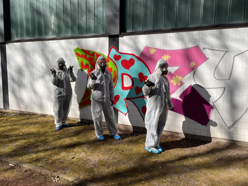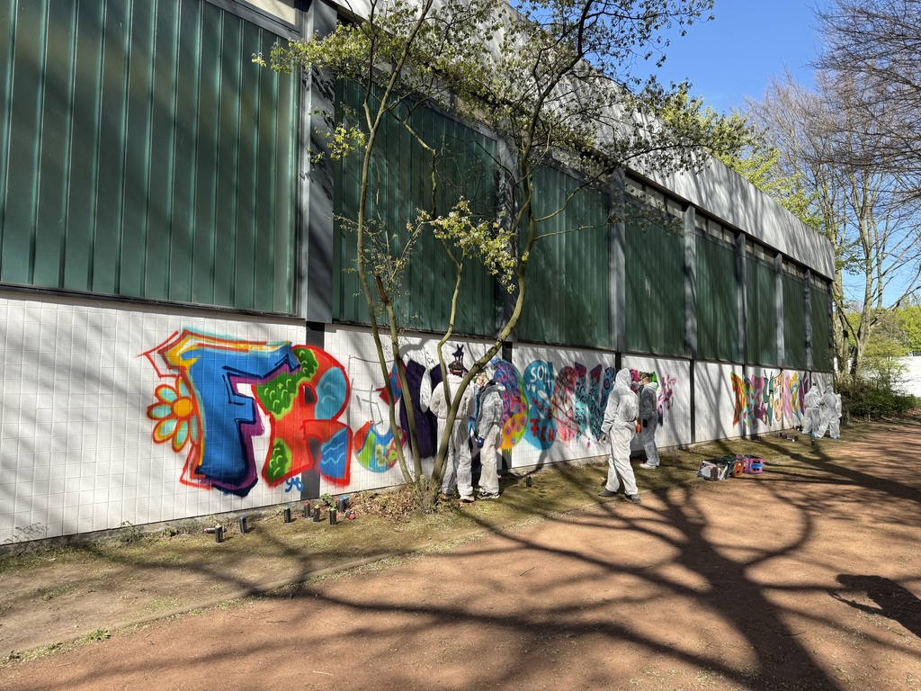 Das 30-jährige Jubiläum der Städtepartnerschaft zwischen Olsztyn (Polen) und Gelsenkirchen ist der feierliche Anlass für ein außergewöhnliches Projekt, an dem Schüler:innen des Max-Planck-Gymnasiums und der Partnerschule Lyzeum Nr. 5 in Olsztyn teilnahmen. Im Mai 2023 wurden innerhalb von einer Woche die Außenwände unserer Sporthalle in ein buntes Graffitikunstwerk verwandelt, das bekannte Motive aus Olsztyn und aus Gelsenkirchen gleichermaßen beinhaltet. Rund 60 MPG-Schüler:innen der Jahrgangsstufen 8, 9, EF und Q1 griffen vom 03. bis zum 11. Mai unter der Anleitung des Street-Art-Künstlers Daniel Dinsing voller Elan und Einfallsreichtum zu den Sprühdosen, um die Städtepartnerschaft auf unserem Schulgelände farbenfroh zu illustrieren. Ganz im Sinne des seit 1996 bestehenden Austauschprogramms mit dem Lyzeum Nr. 5 waren zeitgleich Schüler:innen unserer Austauschschule in Olsztyn ebenfalls voller Begeisterung und Kreativität künstlerisch aktiv, sodass die parallele Gestaltung zweier Kunstwerke ein weiteres beeindruckendes Dokument für kooperative Städtepartnerschaft und Schulpartnerschaft darstellt.