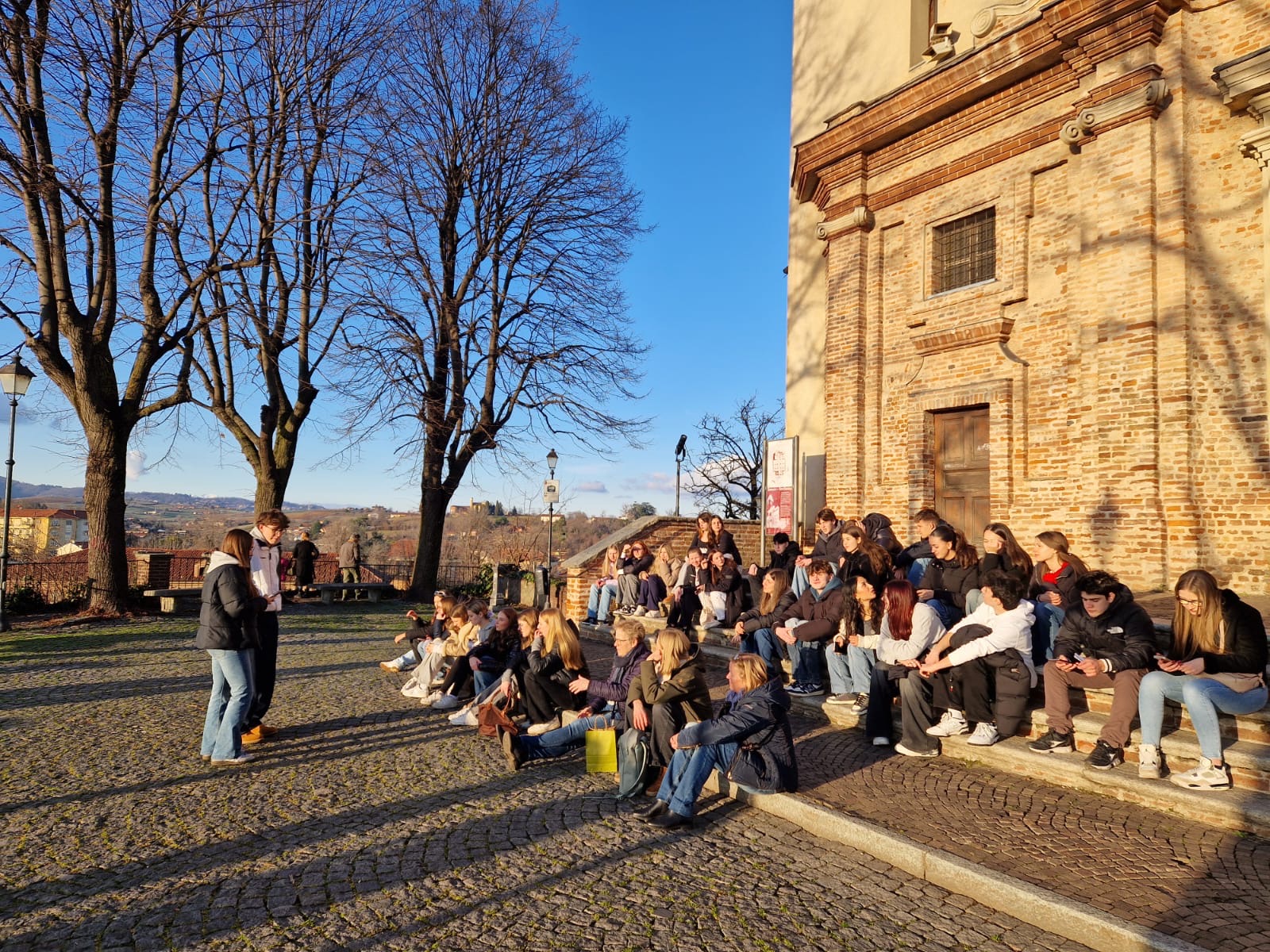 Nach der Anreise per Bus und Flugzeug wurde die Gelsenkirchener Gruppe herzlich von den Gastfamilien und dem italienischen Kollegen Herrn Caldarone in Empfang genommen und zunächst mit kulinarischen Köstlichkeiten verwöhnt. Am Nachmittag führten dann die italienischen Schüler:innen durch ihre piemontesische Heimatstadt Chieri und informierten über einige Sehenswürdigkeiten in Kurzvorträgen in deutscher Sprache. Der erste Tag endete mit einem gemeinsamen Pizzaessen bei 'Don Camillo'.