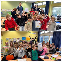 Zu Beginn dieser Woche haben Frau Scharf und Herr Feldhaus die Gewinner der diesjährigen Knobelaufgabe für die Schülerinnen und Schüler der fünften Klassen ausgezeichnet. Die Sieger sind Thilo Herbold (5c) und Ben Föcker (5d), die als Einzige eine richtige Lösung, jedoch mit unterschiedlichen Lösungswegen, gefunden haben. Sie erhalten als Preis eine Urkunde und einen Gutschein über 5 Euro für den Schulkiosk. Die mathematische Knobelaufgabe wird immer zu Beginn des Schuljahres von unserer Schulleiterin Frau Scharf gestellt und regt die Fünftklässlerinnen und Fünftklässler zum Tüfteln und Nachdenken an. Herzlichen Glückwunsch, Thilo und Ben!