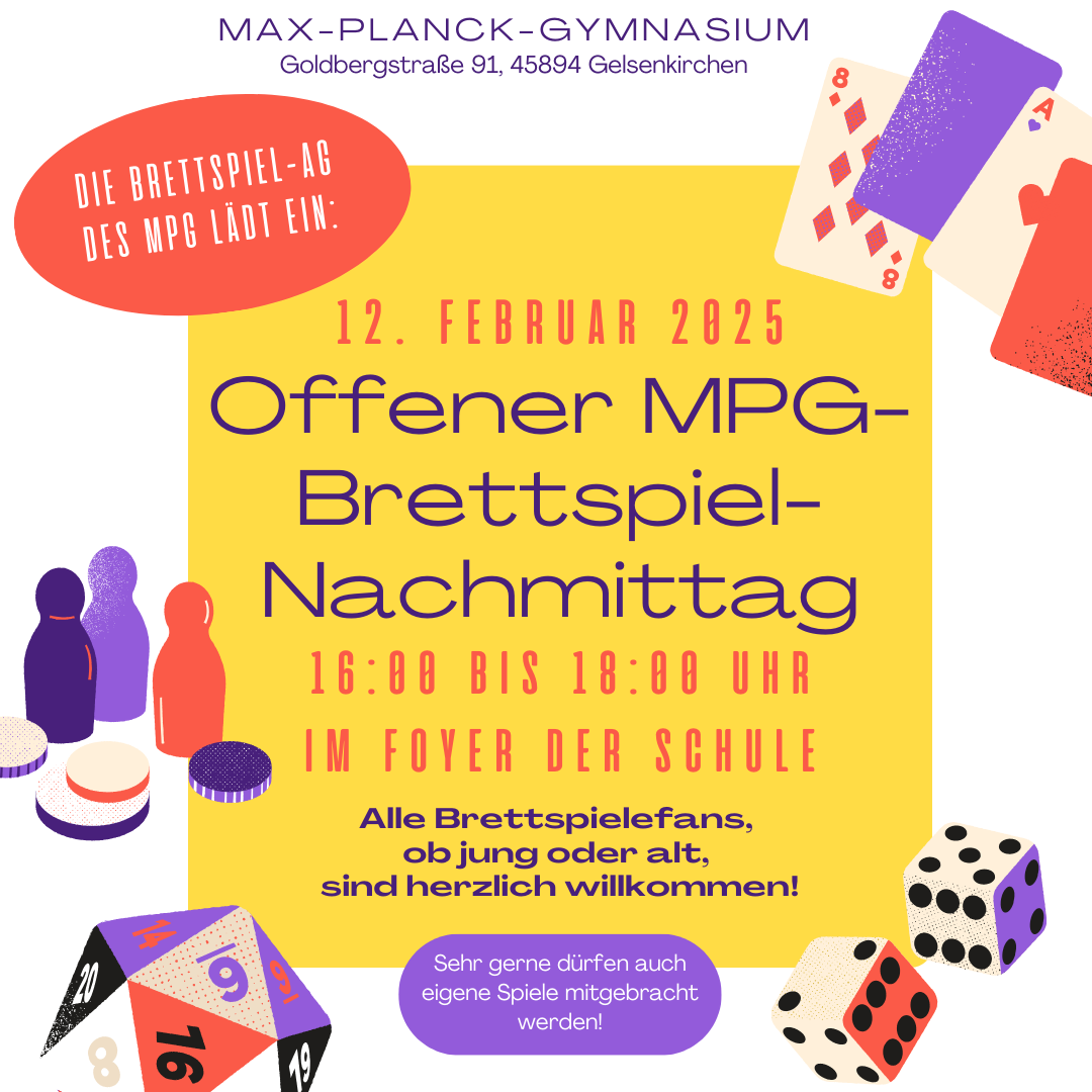 Am 12.02.25 lädt die Brettspiel-AG des MPG zu einem offenen Brettspiel-Nachmittag ein. Von 16 bis 18 Uhr kann dann im Foyer der Schule gespielt werden, was das Zeug hält. Alle Brettspiel-Begeisterten, ob jung oder alt, sind herzlich willkommen! Sehr gerne dürfen auch eigene Brettspiele mitgebracht und gespielt werden. Die Brettspiel-AG freut sich auf einen verspielten Nachmittag!